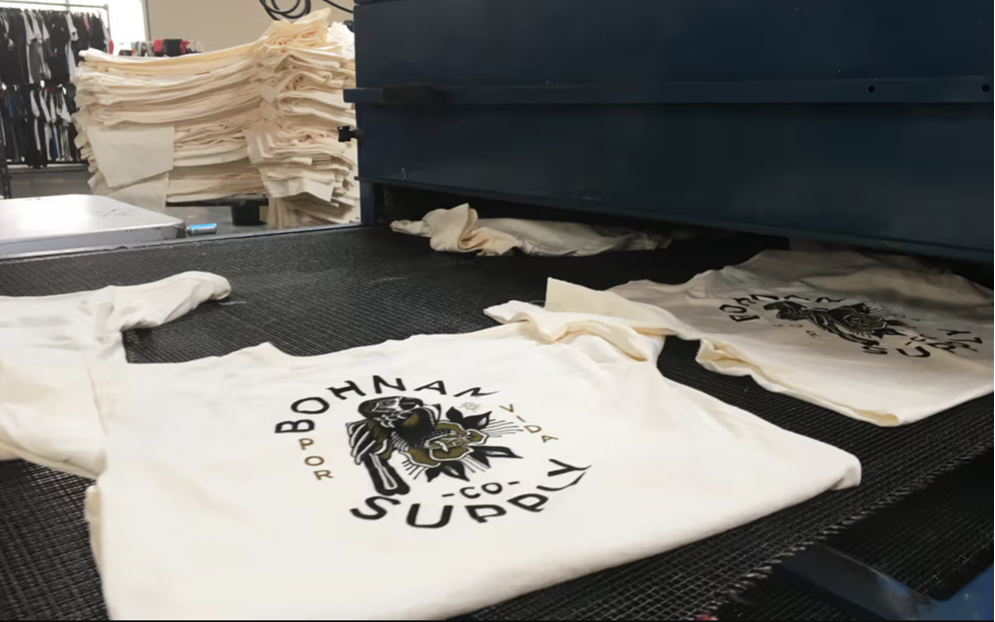 Discharge ink is used to print lighter colors onto dark background fabrics. It works by removing the dye of the garment giving it a natural soft feel.